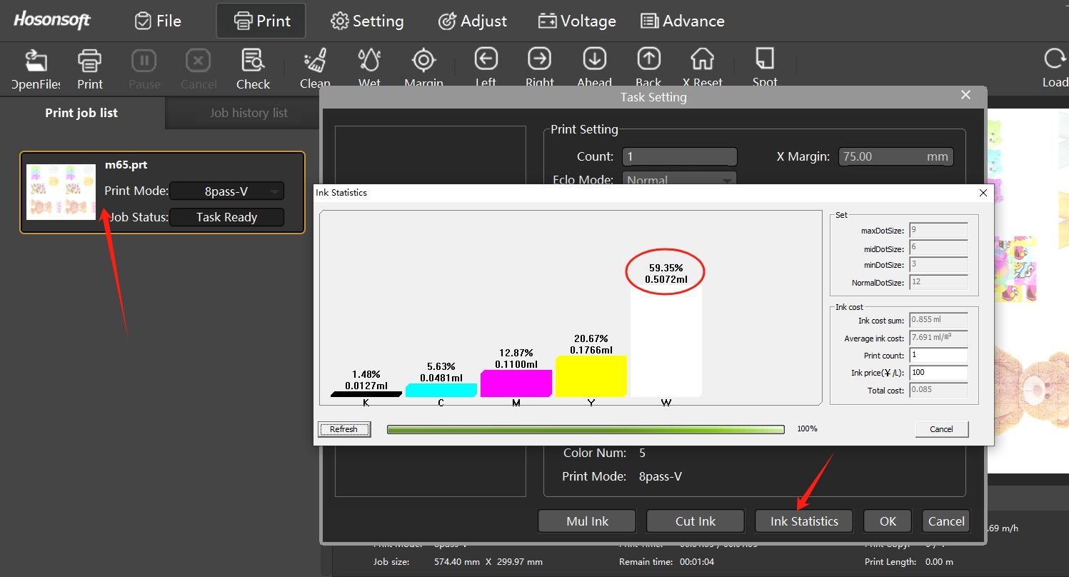 Double-click the job in the print task list, then click "Ink Statistics" to view the ink volume ratio of the corresponding spot color inside.