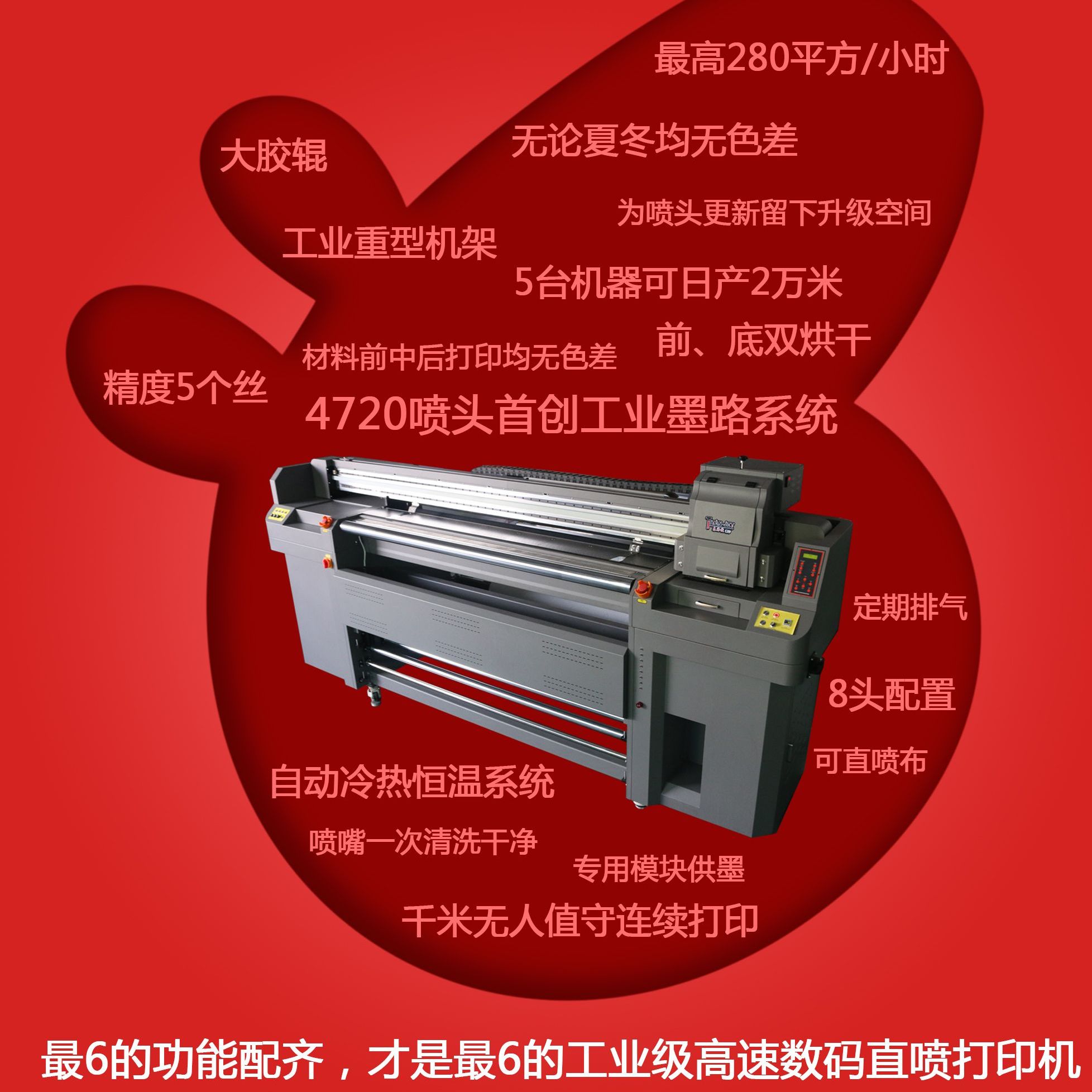 現(xiàn)在的數(shù)碼印花機(jī)更新?lián)Q代得比較快,越來(lái)越往高速印花機(jī)發(fā)展。而現(xiàn)在一些新上市的數(shù)碼印花機(jī)不但打印速度更快,而且還能自動(dòng)一次清洗干凈噴頭,無(wú)需多次清洗,這樣能大大節(jié)省墨水。最為具有代表性的就是泰拓8頭印花機(jī),供墨系統(tǒng)有發(fā)明專利,清洗噴頭可以一次完成清洗干凈,節(jié)省了不少墨水。因此,如果上述三種方法都無(wú)法有效節(jié)省墨水時(shí),不妨考慮換新一代8頭印花機(jī)。