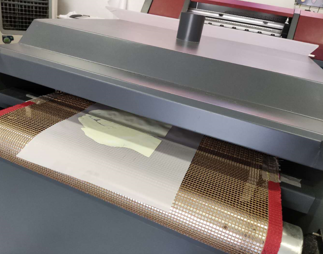 4、通過(guò)導(dǎo)帶傳送進(jìn)行圖案的熱熔粉加熱,增加圖案的水洗牢度,整個(gè)過(guò)導(dǎo)帶的時(shí)間大約2—3分鐘,導(dǎo)帶式傳送會(huì)讓加熱烘焙更加的均勻。