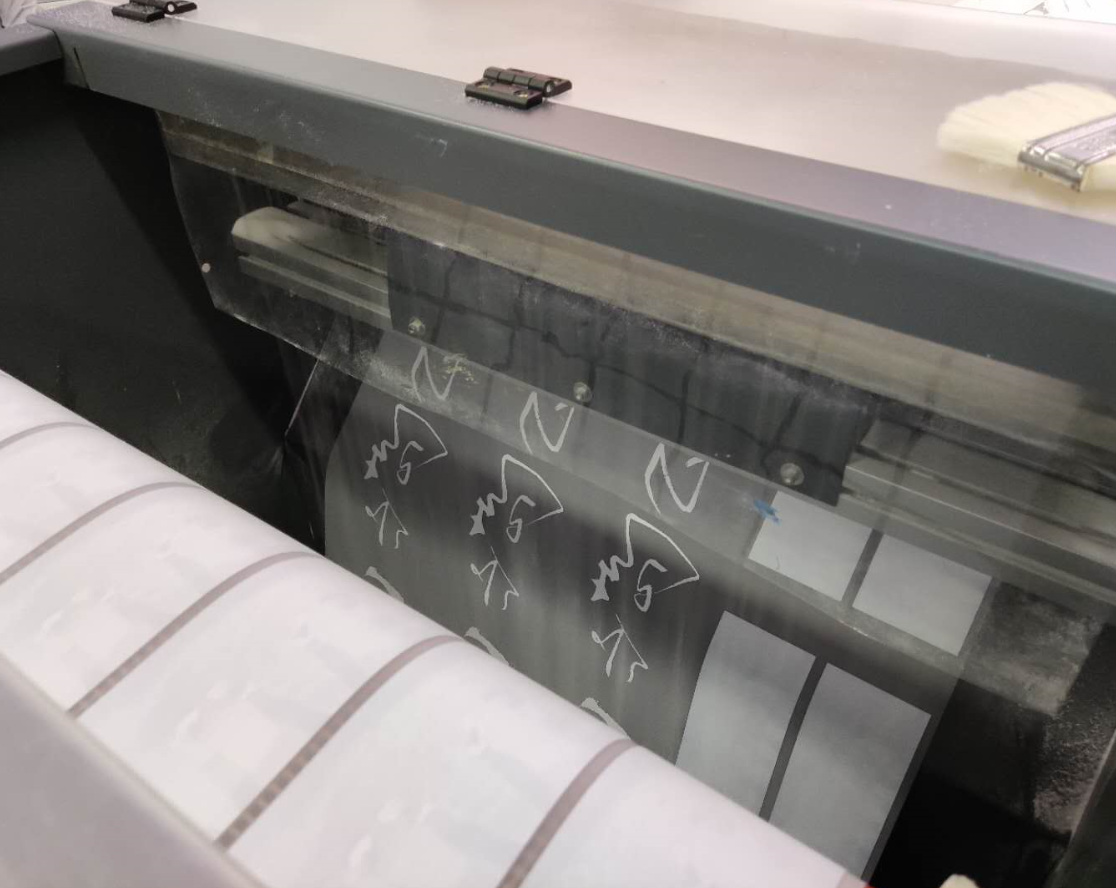 3、機器自動撒粉和自動抖粉,這里也會有加熱系統(tǒng),幫助熱熔粉更好附著在白墨圖層部分