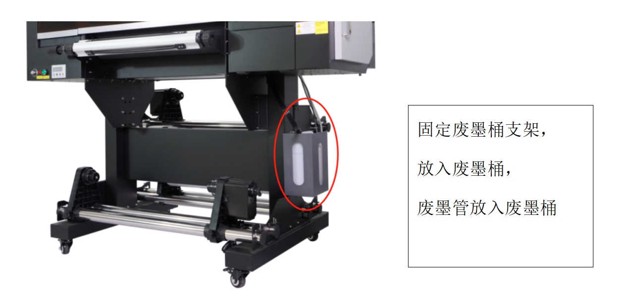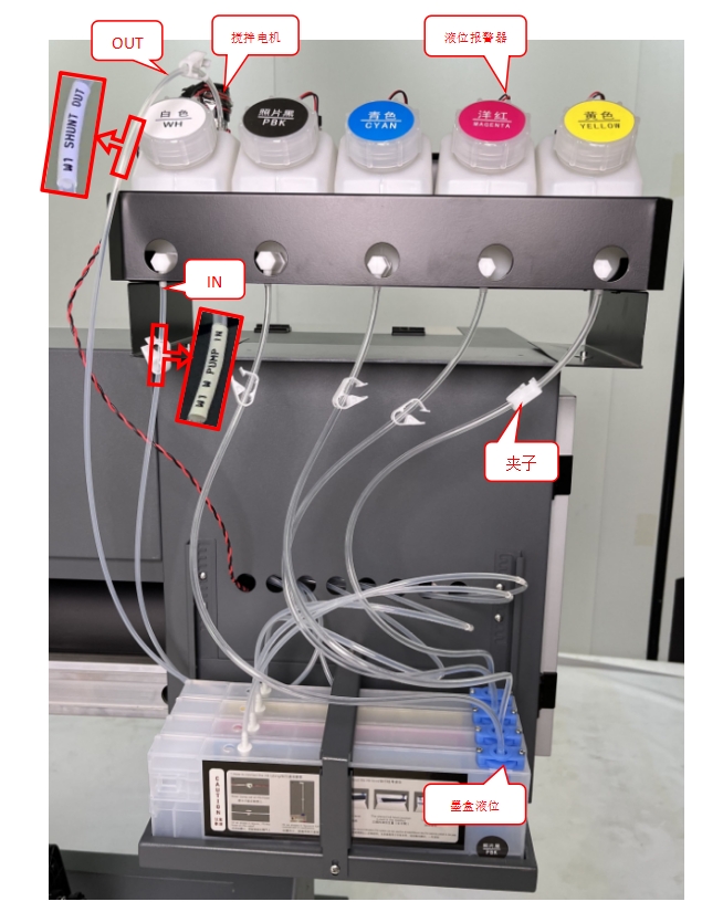 安裝固定主墨桶支架螺絲,然后將墨桶擺放整齊,并連接相應的墨桶和相應的標記墨管。
