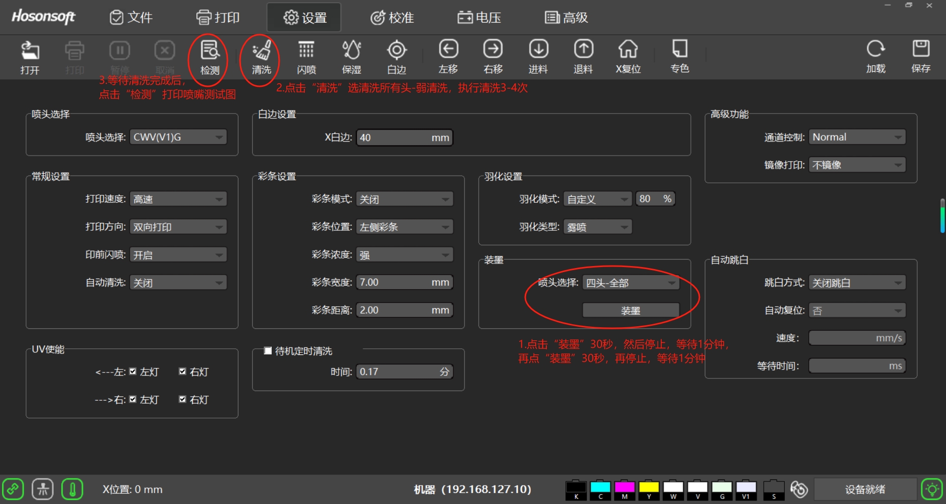 清洗打印頭,點(diǎn)擊軟件裝墨后,然后多次清洗,查看噴嘴是否改善。