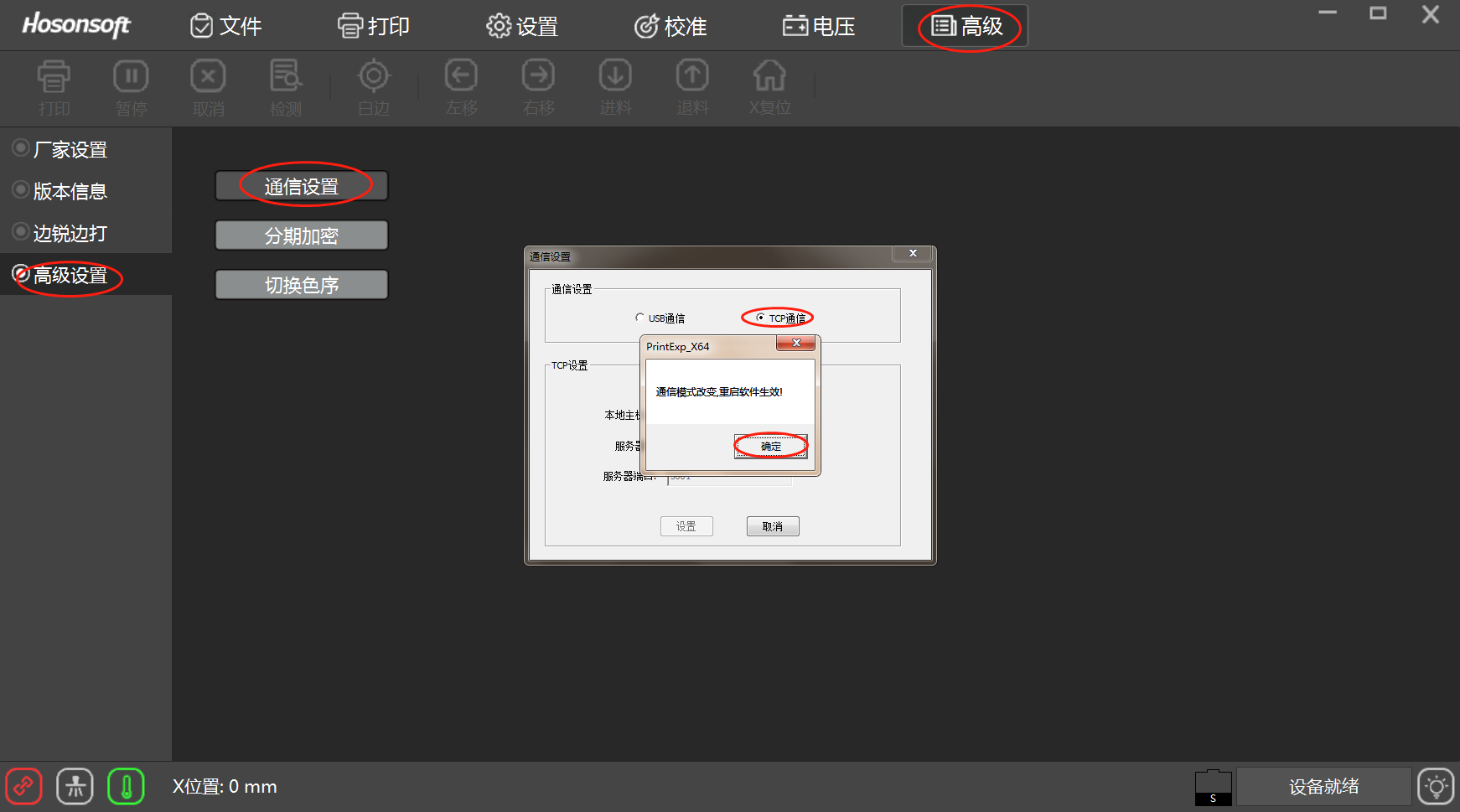 檢查打印軟件的通訊界面是否設(shè)置為“TCP通訊”,