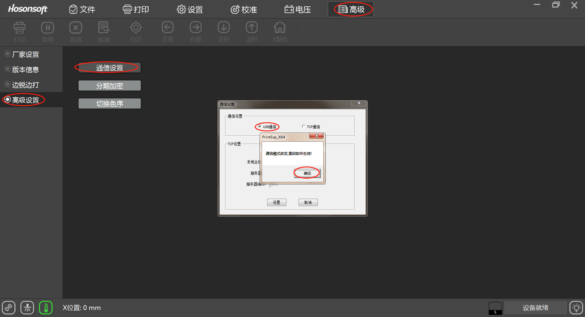 檢查打印軟件的通訊界面是否設(shè)置為“USB通訊”,